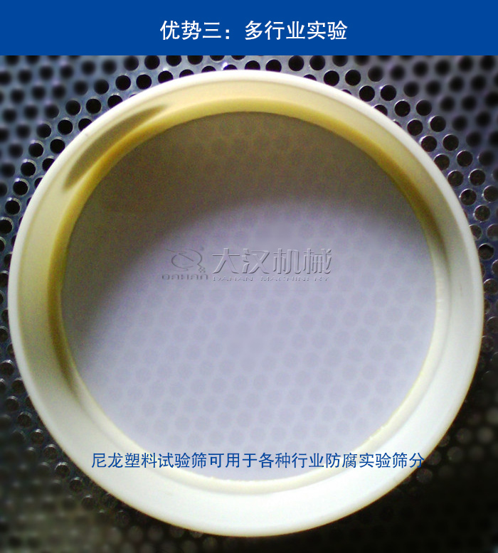大漢機械生產的尼龍塑料試驗篩全部采用PVC材質,不含金屬成分,優質的塑料框加上國家標準的防腐蝕尼龍網,為您隔斷一切產生腐蝕的可能性。在需要防腐的實驗篩分工作中您都可以選擇尼龍塑料試驗篩。