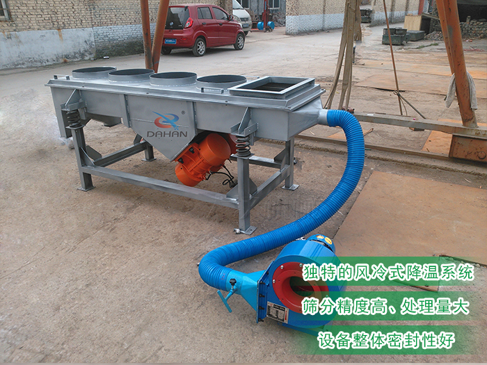 風冷式直線振動篩在進料口底部或箱體下側端增加了風機降溫冷卻系統,在進料口加裝篩網及小型排料口使大顆粒結塊物料從小型排料口中排出,該裝置可有效攔截大顆粒并緩沖物料對篩網的沖擊,延長篩網使用壽命,在物料在進入設備時,位于進料口底部或箱體下側端的風機降溫冷卻系統對其進行降溫作業,在激振力和物料自重力的合理作用下,降溫后的物料在篩面上被拋起、跳躍式向前做直線運動,通過多層篩網過濾不同規格的篩上物及篩下物,分別從各層的出料口排出,達到篩選和分級的目的。