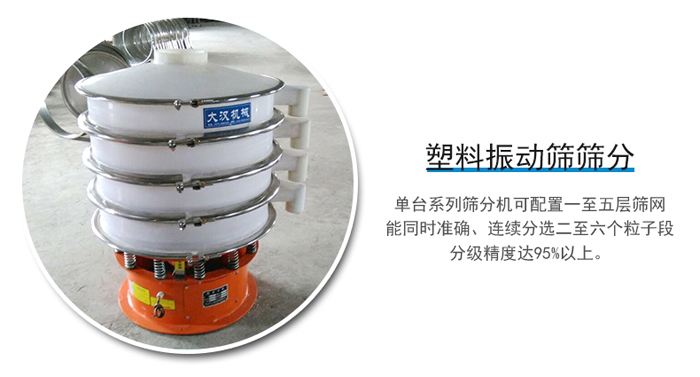 塑料振動篩區別與不銹鋼材質振動篩,就是耐腐蝕性比不銹鋼振動篩要好,篩分就是把固體顆粒分成大小相等的不同粒子組。單臺系列篩分機可配置一至五層篩網,能同時準確、連續分選二至六個粒子段;分級精度達95%以上。